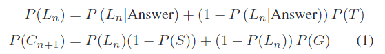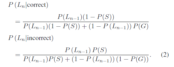 此外,P(L0)代表最初的掌握概率。BKT在一个双状态的学生建模框架内运作:知识要么被学习,要么未被学习,然后是经过知识处理的知识。根据对学生学习互动的观察,利用以下公式来估计知识状态和正确答案的概率: