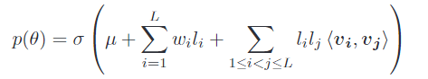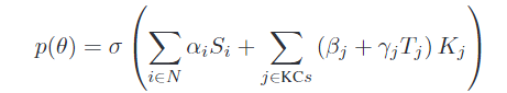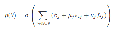 它根据事件中涉及的所有特征的稀疏权重集来模拟学生的知识掌握情况。设L为特征的数量;这里,特征可以与学生、练习、KC或任何其他侧面信息有关。学习互动由长度为L的稀疏向量l来编码。当特征i参与互动时,l i > 0,正确答案的概率p(θ)由以下公式决定