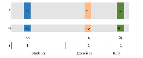 KTM模型采用了因子化机(FMs),将Logistic模型推广到更高维度。调频最初是作为一个通用的预测器被引入的,能够处理任何实值的特征向量,使模型能够使用因子化参数表示变量之间的所有相互作用。调频器提供了一种将有关练习或学生的侧面信息编码到模型中的方法。下图说明了KTM的例子。