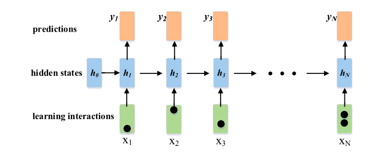 这里tanh是激活函数,W hs 是输入权重,W hh 是递归权重,W yh 是读出权重,b h和b y是偏置项。尽管与贝叶斯和逻辑模型相比表现出卓越的性能,但DKT有几个固有的缺点。例如,缺乏可解释性是一个重要的缺点。要理解隐藏状态如何代表学生的知识状态是很有挑战性的,模型不能明确地从隐藏状态中确定学生的知识掌握情况。然而,尽管有这些缺点,DKT仍然是一种有前途的KT模式