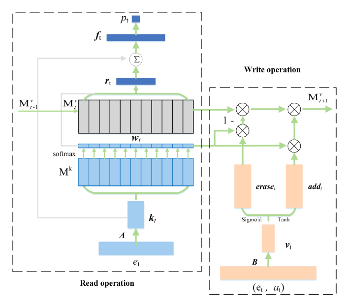 其中,相关权重w t代表练习和所有潜在KC之间的相关性。在读操作中,DKVMN根据学生的知识掌握情况来预测学生的表现。具体来说,DKVMN参照价值矩阵中所有记忆向量的加权和,用相关权重读取学生掌握练习r t的情况。然后,读取的内容和输入的练习嵌入被串联在一起,并传递给全连接层,产生一个摘要向量f t,其中包含学生的知识掌握情况和练习的先前难度。此外,学生的表现可以通过应用另一个具有sigmoid激活函数的全连接层来预测总结的向量。