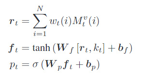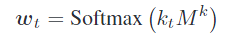 首先定义一个嵌入矩阵,以获得练习的嵌入向量k t。然后通过取练习嵌入k t和关键向量Mk之间的内积得到相关权重w t,然后是softmax激活: