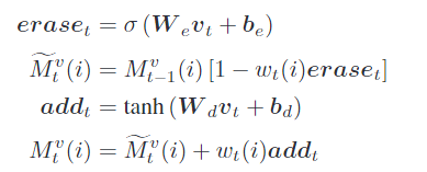 其中W f和W p是权重,b f和b p是偏置项。在写操作中,在回答完一个练习后,DKVMN根据学生的表现更新他们的知识掌握情况(即价值矩阵)。具体来说,学习互动(e t,a t)首先被嵌入一个嵌入矩阵B,以获得学生的知识增长v t。然后 , DKVMN 从 v t 中计算出一个擦除向量 erase t , 并参照擦除向量和相关权重 w t 决定擦除以前的记忆。擦除后,新的记忆向量由新的知识状态和添加向量add t更新,形成一个擦除-跟随-添加机制,允许在学习过程中遗忘和加强知识掌握。