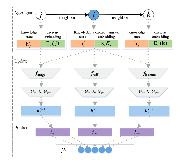 它由以下三部分组成:1)聚合;2)更新;3)预测。在聚合模块中,GKT聚合了被回答的KC i的时间知识状态和嵌入它邻近的KC j。